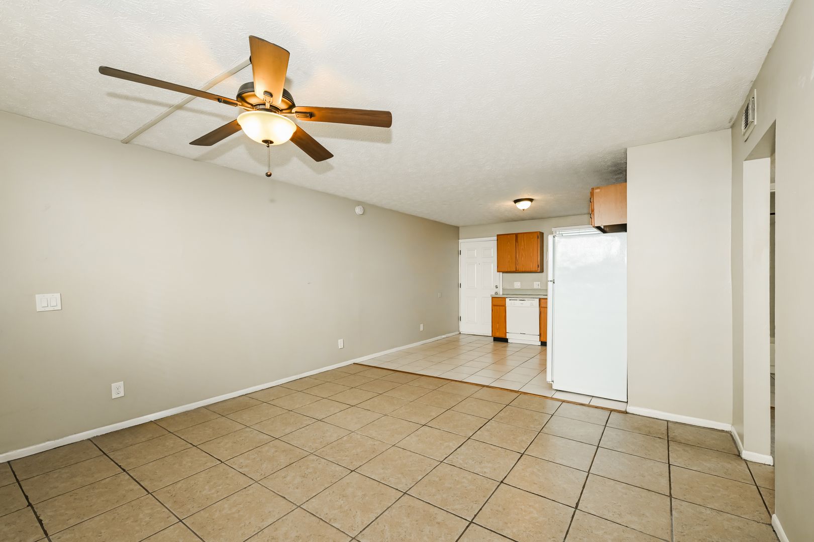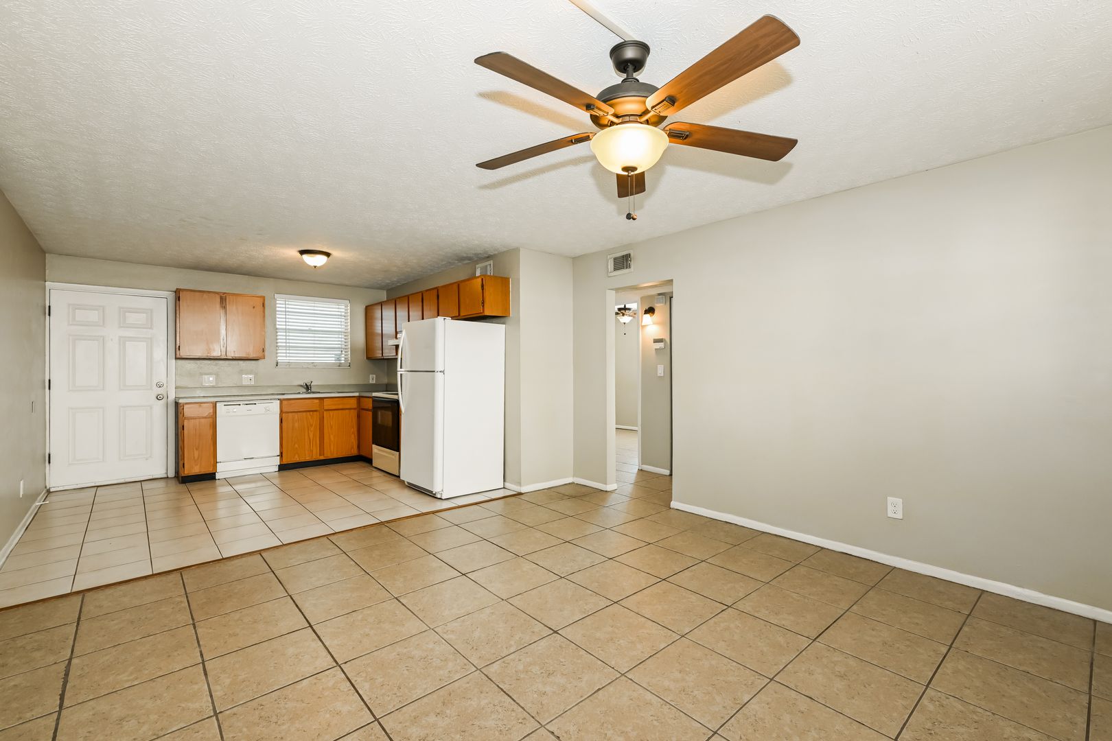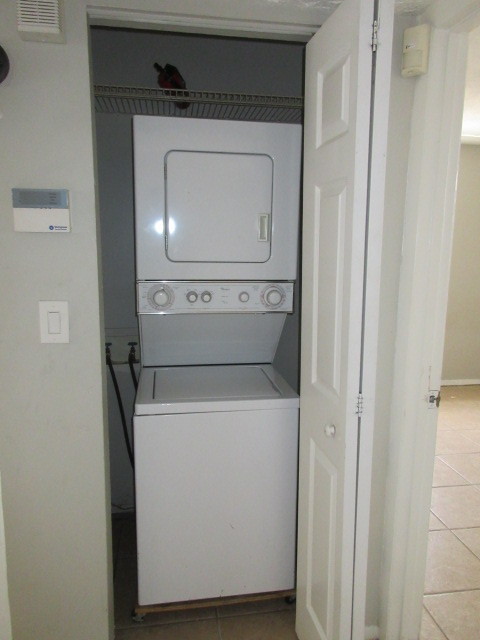 Apartment includes refrigerator, stove, dishwasher and stacked washer / dryer unit. Open floor plan -- kitchen opens to living room.