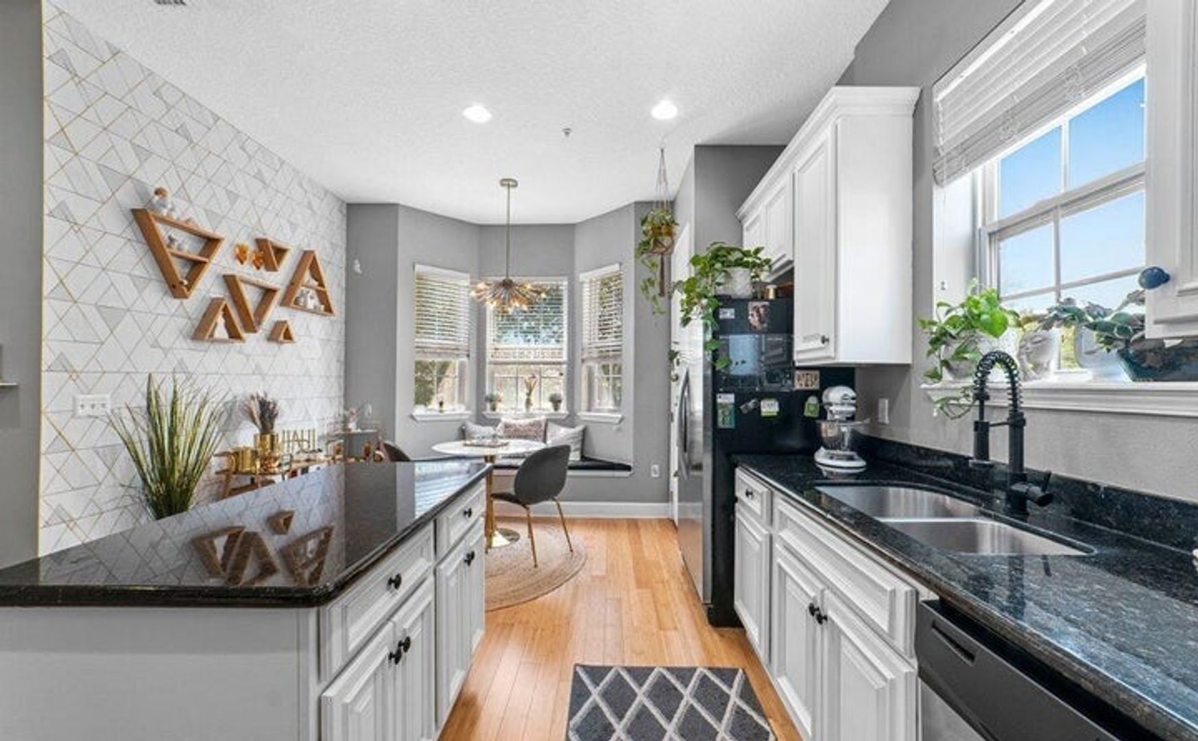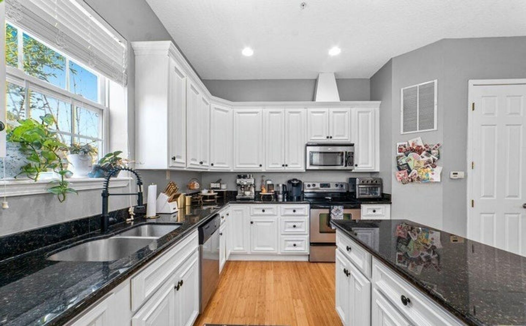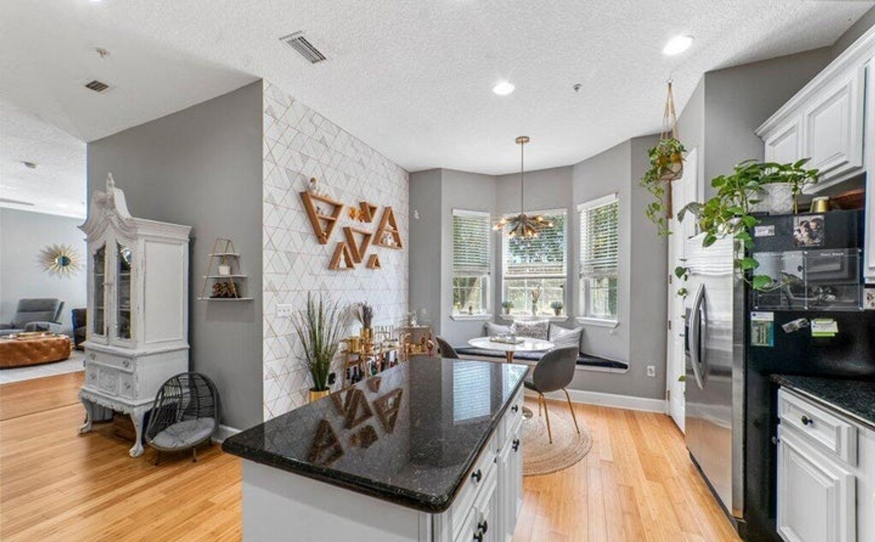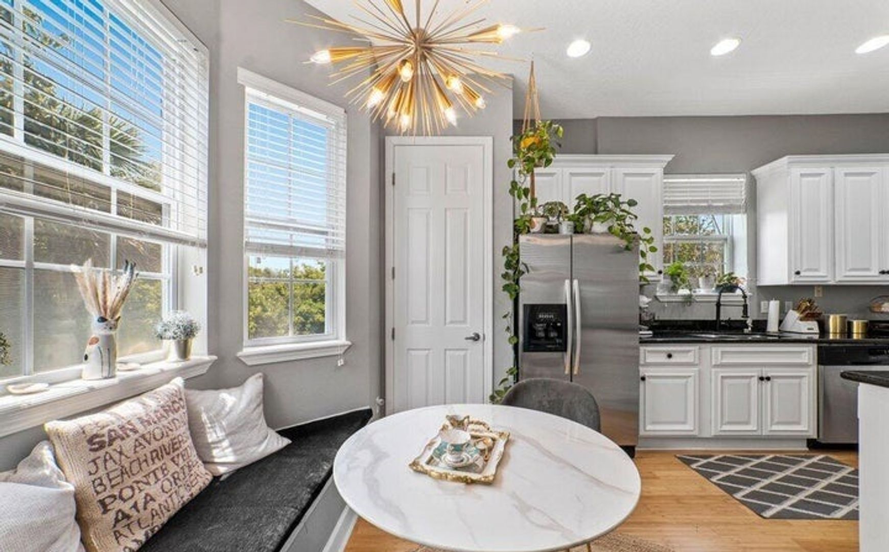 Step inside to find beautiful bamboo flooring that flows through the main areas, enhancing the bright, open atmosphere. The spacious, elegant gourmet kitchen features a cozy breakfast nook with a charming French Cafe style – perfect for morning meals.